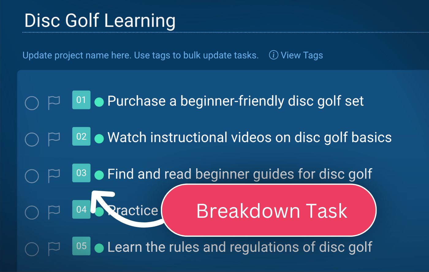 Break down any task with a single click. If you're not sure how to begin, hit the Breakdown Task button and OneBin will generate a new project with clear, simple set of steps to move you forward.