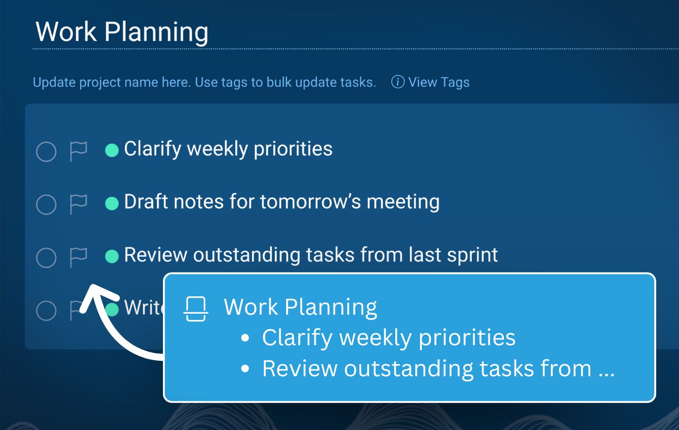 Add quick inline tags for projects, dates, or priorities as you capture. Stay in flow and let OneBin keep everything tidy while you keep moving.